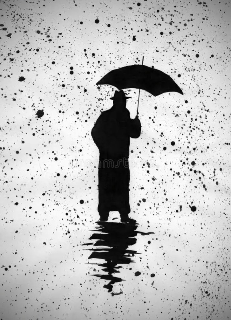 Mit großen Augen sieht sie, wie er seinen Kopf in den Nacken legt, kurz verharrt, und nach einem Moment den Schirm aufspannt. Dann setzt er den Weg fort, leicht gebückt und behäbig wie vorher, als wäre nichts geschehen. Kein Mensch käme im Traum darauf, was er soeben getan hat.